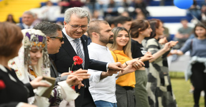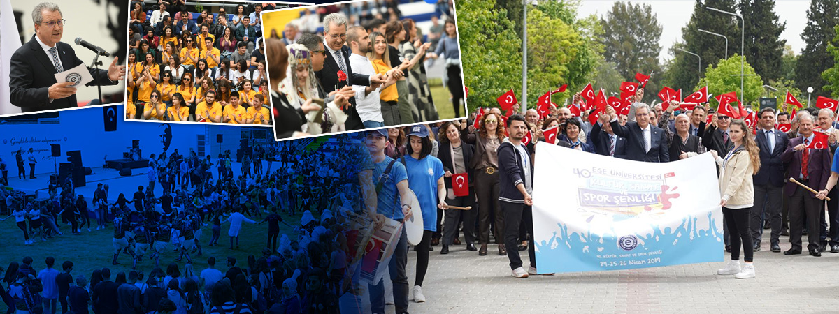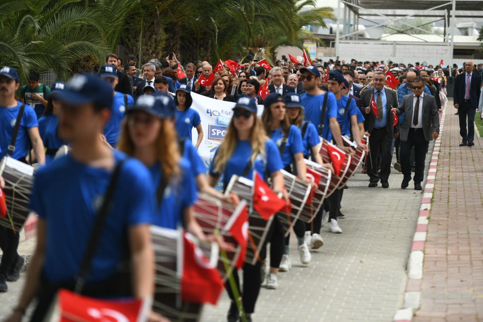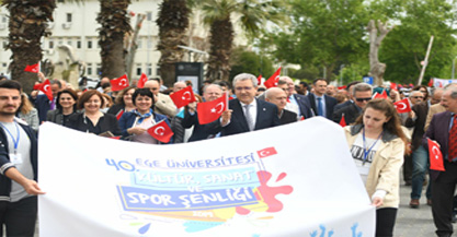 Ege Üniversitesi “40. Kültür, Sanat ve Spor ÅženliÄŸi”, renkli görüntülerle baÅŸladı. Prof. Dr. Sermed Akgün Kapalı Olimpik Yüzme Havuzu önünden baÅŸlayan “Åženlik YürüyüÅŸü” ile baÅŸta Ege Üniversitesi Rektörü Prof. Dr. Necdet Budak olmak üzere, Üniversite üst yönetimi, senato üyeleri, çalışanlar ve öÄŸrenciler; ellerinde Türk Bayrakları ile 55 Ege Kampüs Tören Åžölen Alanı’na kadar yürüdü. Burada oluÅŸturulan ÅŸenlik halayında katılımcılar coÅŸkuyla halay çekti. Rektör Budak, kurulan stant alanında “Balık Herkes İçin SaÄŸlıktır” sloganıyla EÜ Su Ürünleri Fakültesi tarafından hazırlanan balık-ekmekleri öÄŸrencilere dağıtıldı.