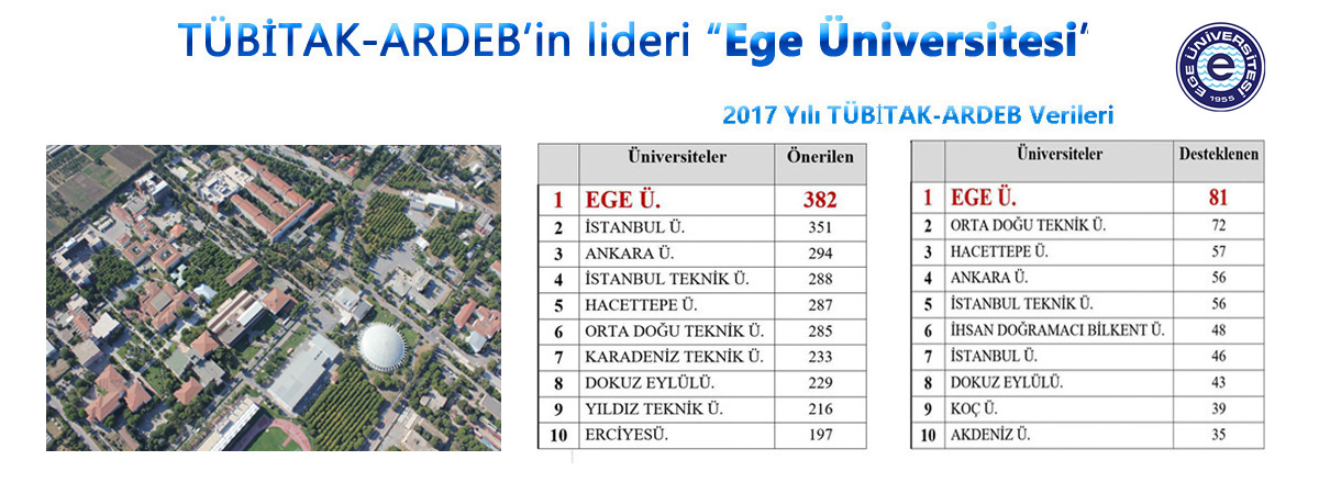 Türkiye Bilimsel ve Teknolojik AraÅŸtırma Kurumu (TÜBİTAK) AraÅŸtırma Destek Programları BaÅŸkanlığı (ARDEB ) altında 2017 yılında verdiÄŸi destek istatistiklerini yayınladı. Bu istatistiklere göre Ege Üniversitesi 2017 yılı ARDEB projelerinde; en fazla  proje baÅŸvurusu yapan ve en çok sayıda projesi kabul edilen üniversite oldu. Ege Üniversitesi, projelere aktarılan bütçe sıralamasında ise 27,41 Milyon TL ile üçüncü sırada yer aldı.