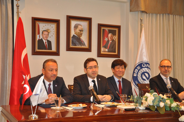 Ege Üniversitesi adına bu protokolü imzaladığı için çok mutlu olduÄŸunu söyleyen Rektör Yardımcısı Prof. Dr. Ali Saffet Gönül, “Türkiye ve Kore gerçekten çok yakın dost ülkeler. Ülkelerimiz arasında sınır olamamasına karşın ortak bir tarihi paylaşıyoruz. Bu tarihi kardeÅŸ ülke Kore ile paylaÅŸmaktan mutluyuz. Bu protokol ile bilimsel iÅŸbirliÄŸi anlamında kardeÅŸliÄŸimizin bir baÅŸka aÅŸamaya geçeceÄŸine inanıyorum. Prof. Dr. Hang-Seok Chang ve Doç. Dr. Özer Makay’a imzalamaktan mutluluk duyacağımız bu protokolü bize getirdikleri için özel olarak teÅŸekkür etmek istiyorum” dedi.